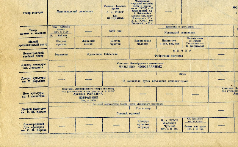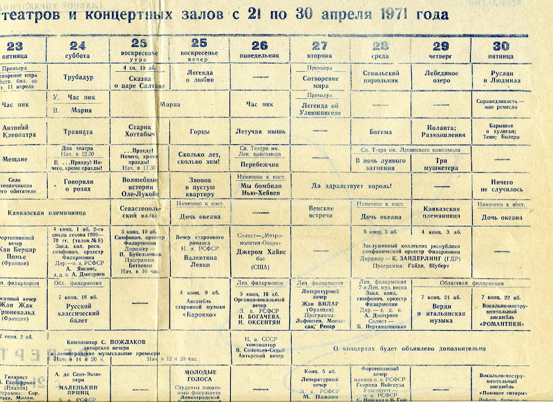 Мы смотрели в ту афишу – декадник на пустые клеточки – "будет объявлено". (Афиш в городе не было).